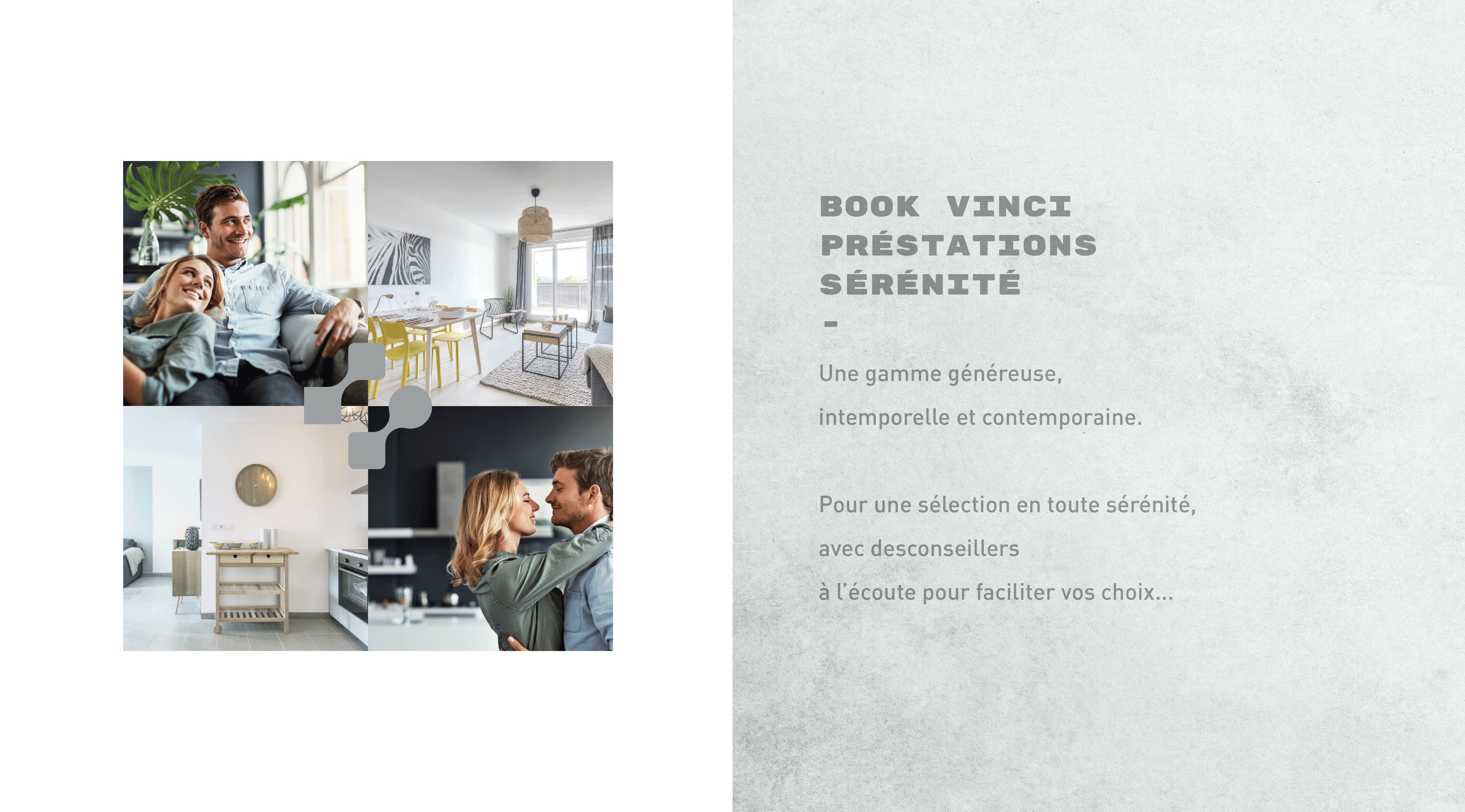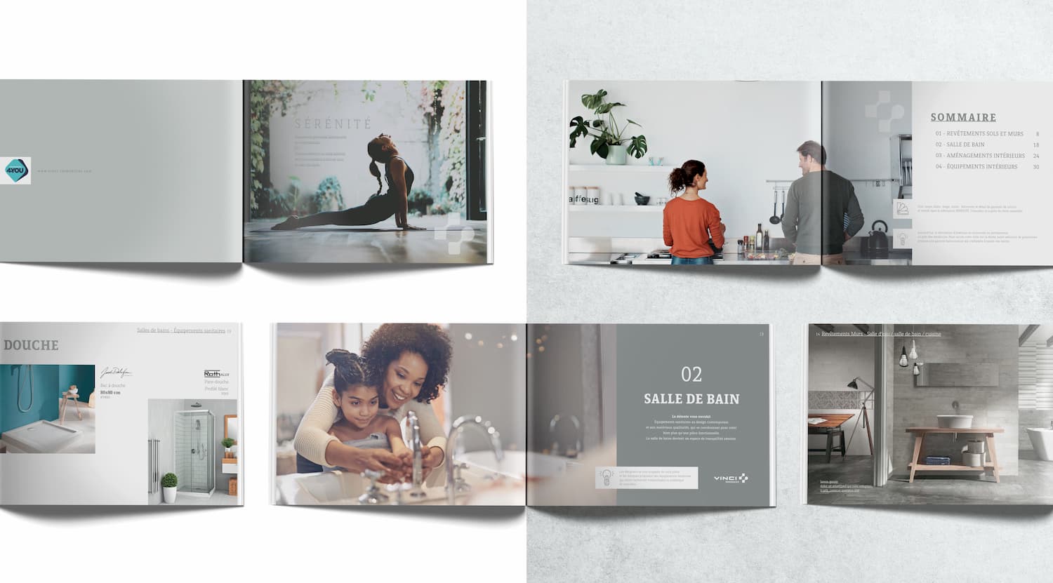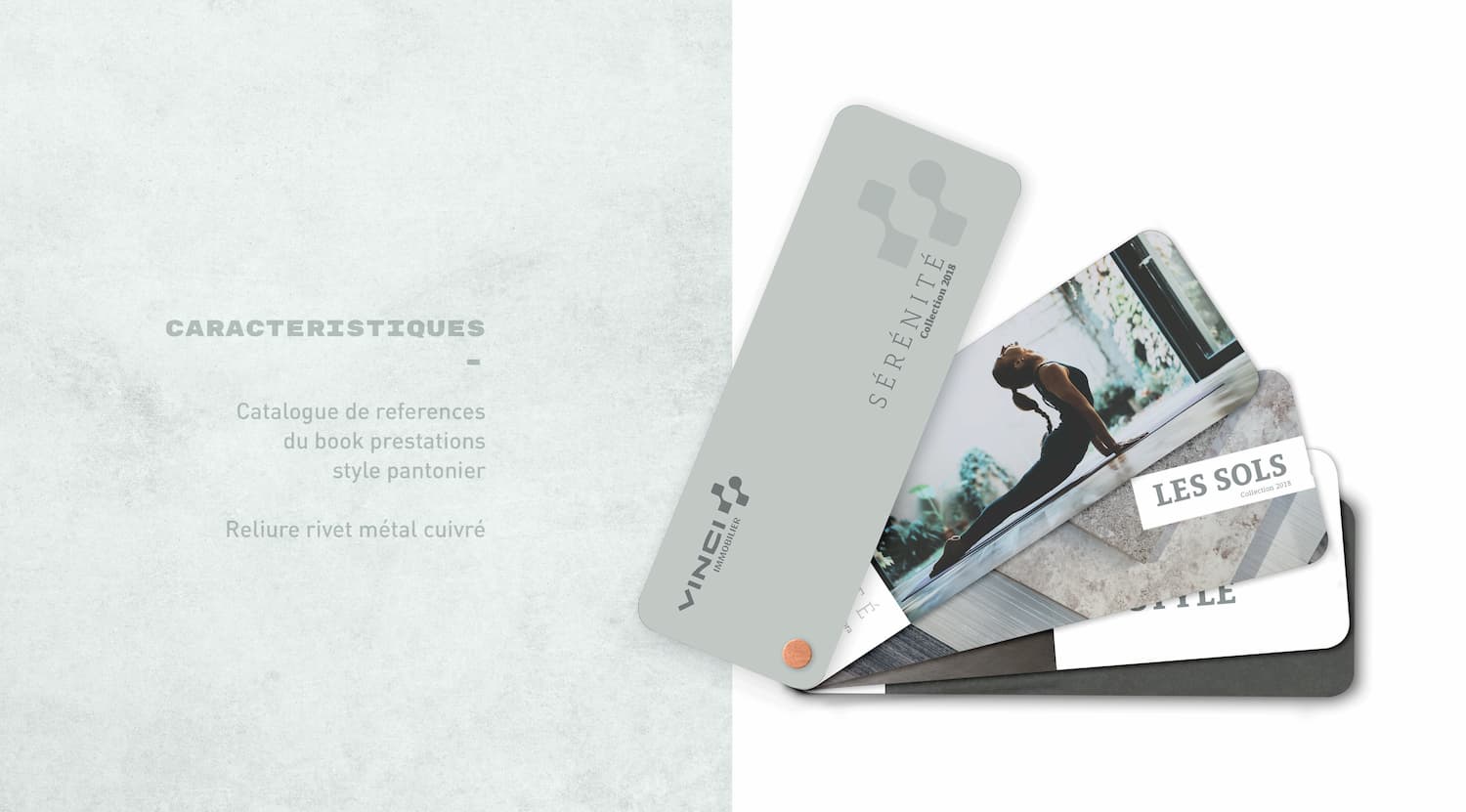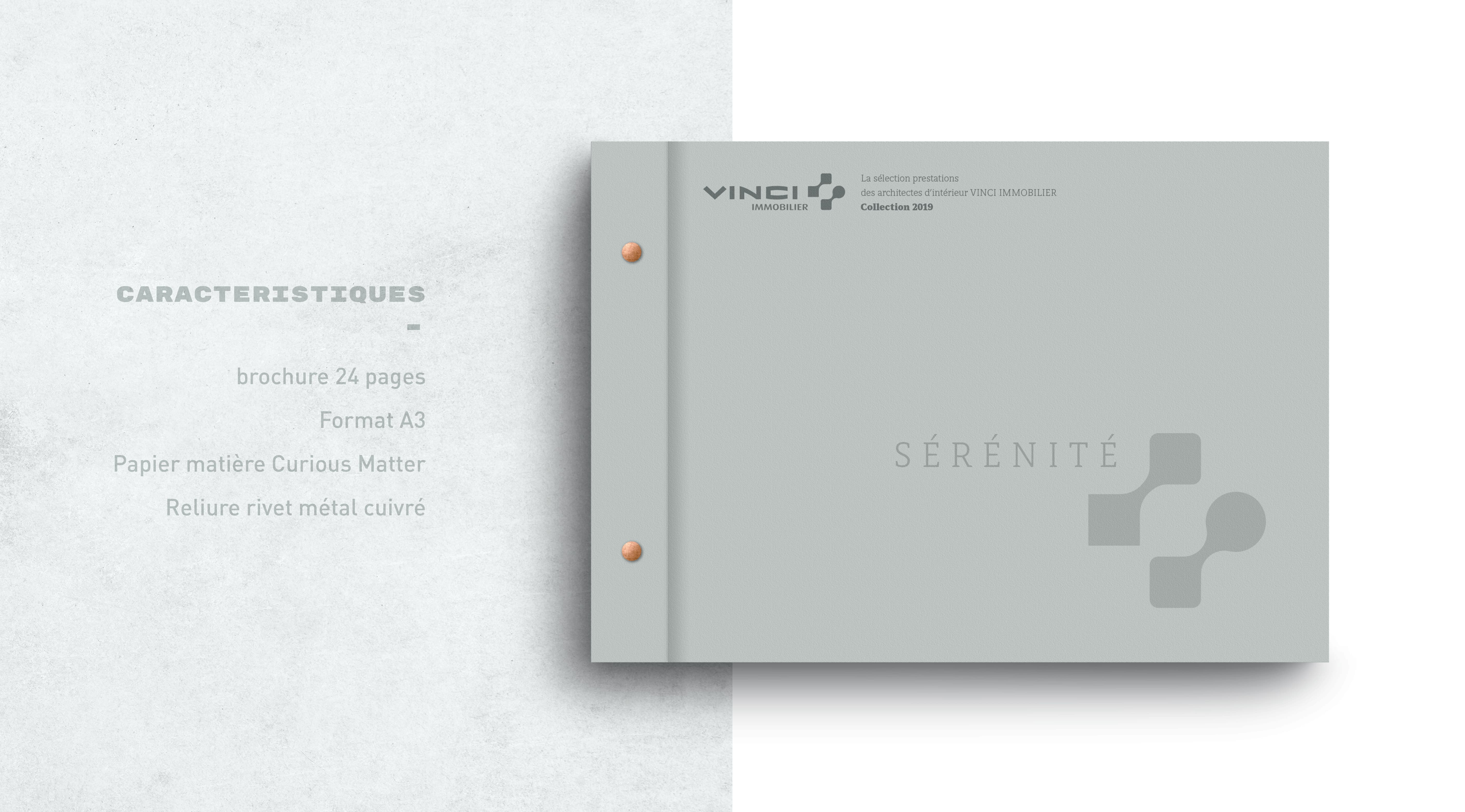 Pour offrir aux futurs acheteurs le choix de la personnalisation de leurs appartements, VINCI Immobilier a voulu créer une gamme de prestations appelé Sérénité déclinée en deux formats, un book A3 pour bien choisir son futur intérieur et un pantonier pour trouver les bonnes références produits. Une édition soignée avec reliure en rivets cuivrés et papier matière.